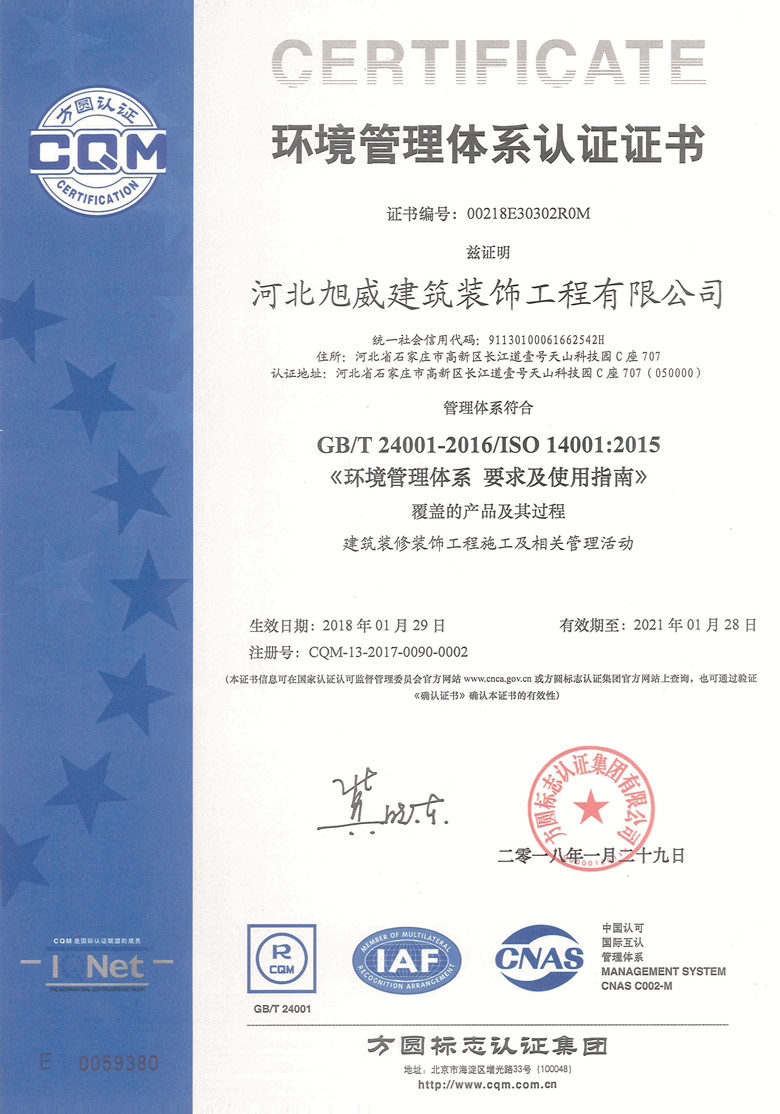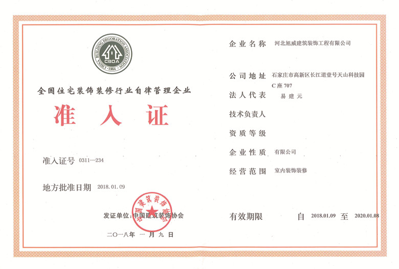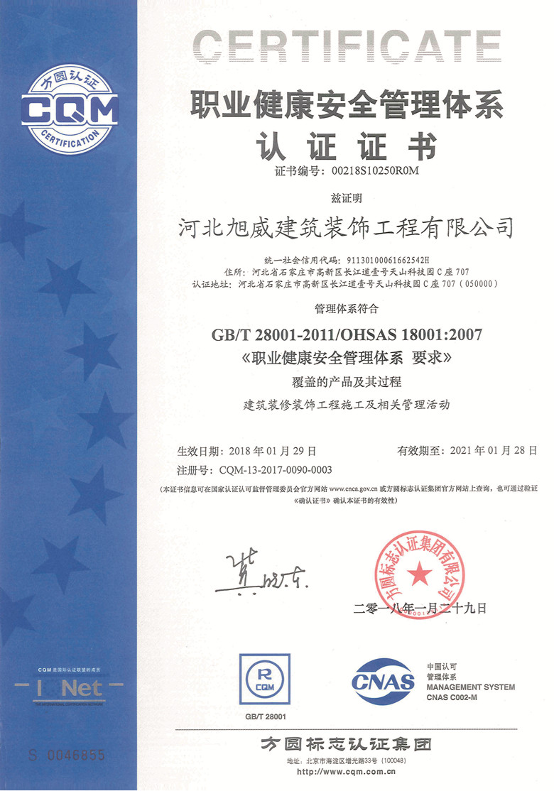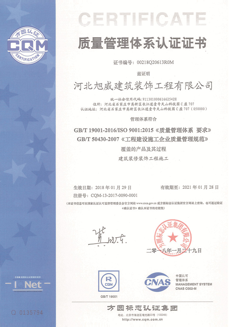 河北旭威建筑装饰股份有限公司成立于2013年1月24日,位于石家庄市高新区长江道壹号天山科技园C座,是一家集设计、预算、施工、材料于一体的专业化装饰公司。公司从事装饰装修行业多年,目前已获得“建筑装修.装饰工程贰级资质、安全生产许可证、ISO9001质量.环境.安全三大管理体系认证”等。