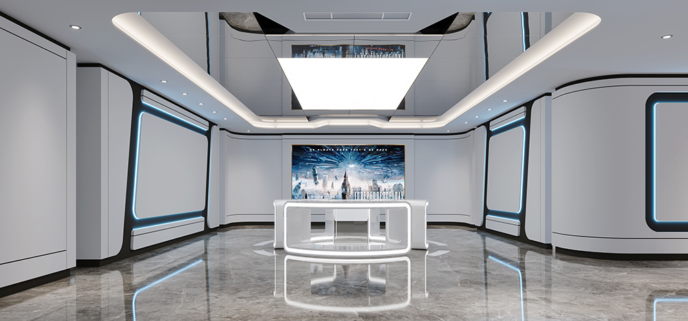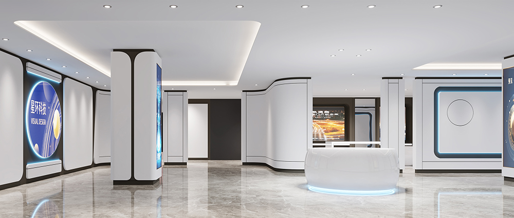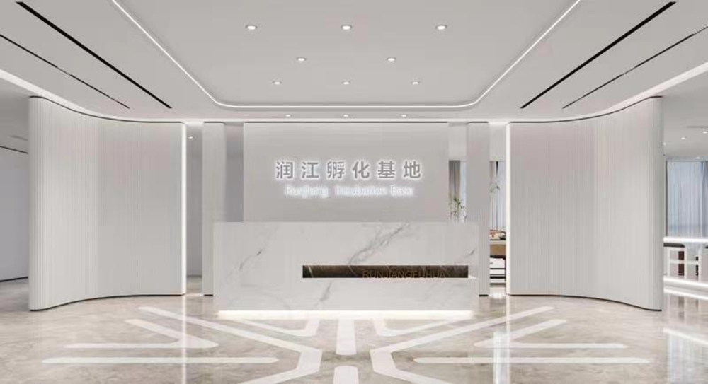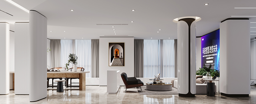 前厅采用白色加莫兰迪色系中的灰色暗纹,使得整体沉稳大气,精巧的引导台设计,给人一种高端大气的形象,显得未来感十足,更契合高新产业的氛围科技感,打造更为现代化的空间。