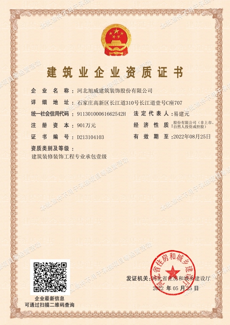 旭威成功升级建筑装修装饰工程专业承包壹级