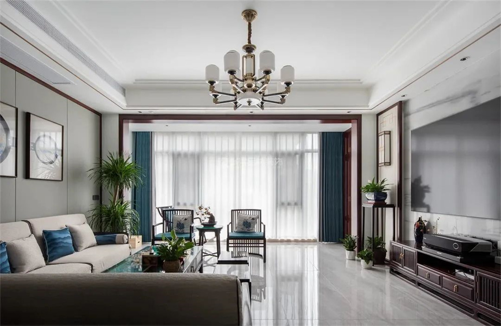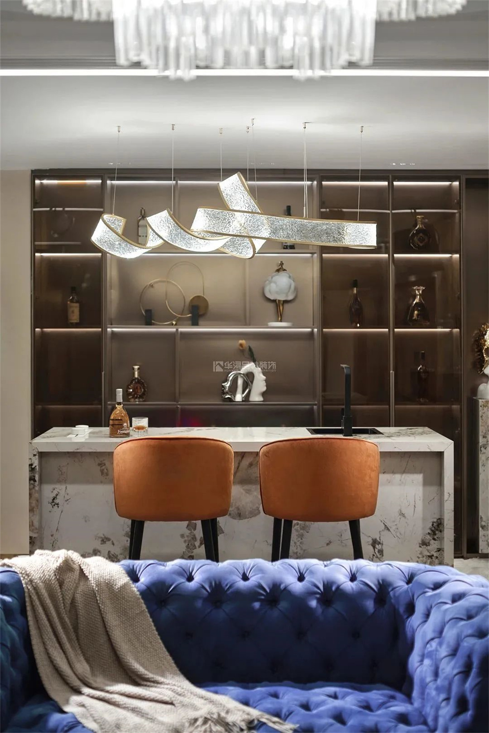 比如下图,风格定调为高级轻奢,在宝蓝色、金属、橙色系、绿色的碰撞下,空间的奢华格调尽显,品位不俗。